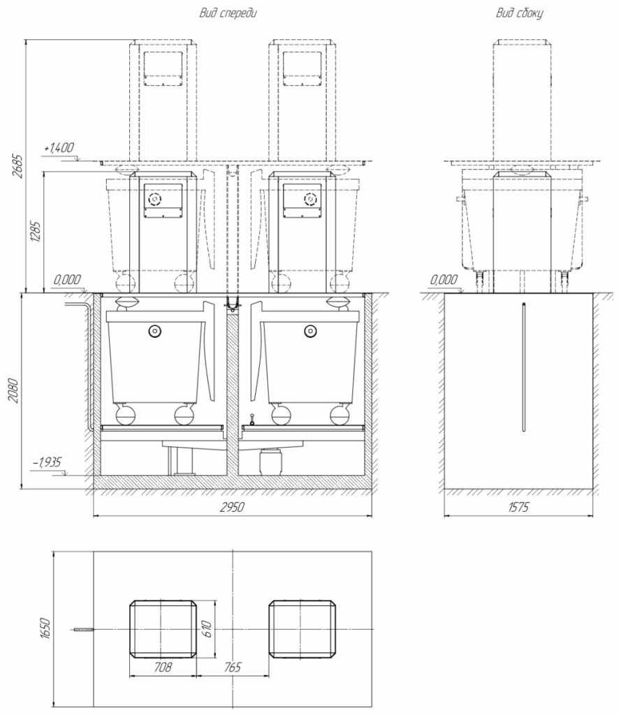 При наполнении подземных контейнеров оператор управляющей компании при помощи пульта дает команду гидравлической системе на подъем площадки с подземными мусорными контейнерами. После опустошения подземные контейнеры по команде оператора опускаются