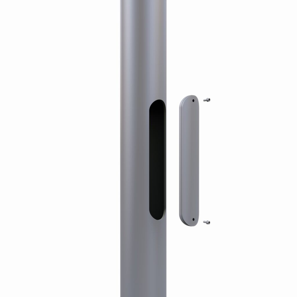В нижней части опоры для распределения кабелей имеется ревизионный люк, под ним размещены планки для установки комплектующих и точка заземления (болтовое соединение М10).